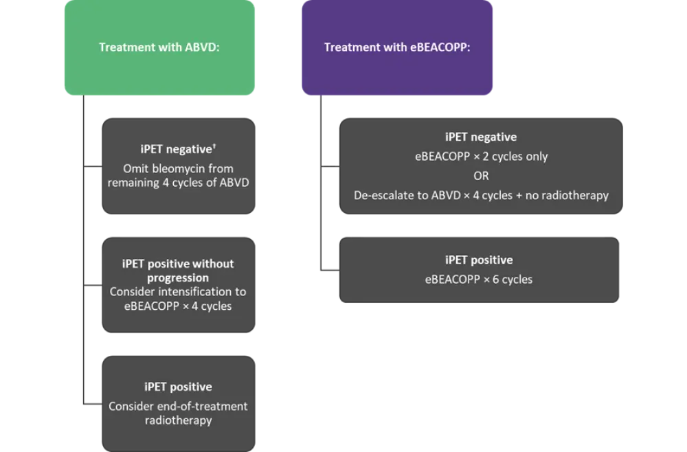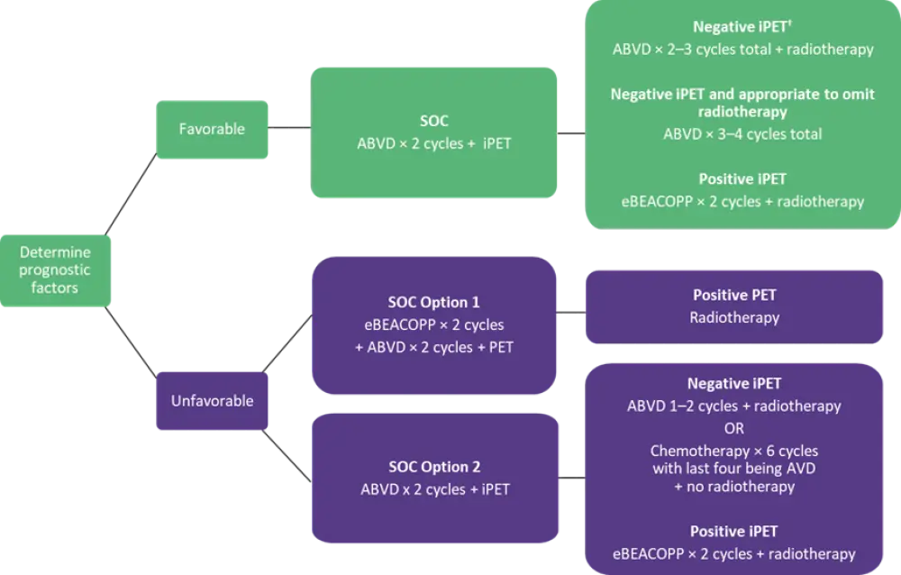 In patients with early-stage unfavorable disease who achieve negative iPET, radiotherapy can be safely omitted with no risk to tumor control with an intensive initial chemotherapy approach. These patients can be started early on either escalated bleomycin, etoposide, doxorubicin, cyclophosphamide, vincristine, procarbazine, and prednisolone (eBEACOPP) or ABVD (Figure 1).