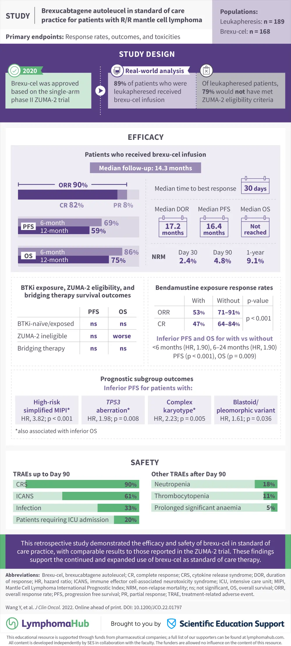 The Lymphoma Hub is pleased to present a visual abstract summarizing key safety and efficacy outcomes from a recent retrospective study investigating brexucabtagene autoleucel, an autologous CD19-directed chimeric antigen receptor T-cell therapy, as standard of care practice in patients with relapsed/refractory mantle cell lymphoma. In 2020, the U.S. Food and Drug Administration (FDA) approved brexucabtagene autoleucel for the treatment of relapsed/refractory mantle cell lymphoma; this approval was based on results of the phase II ZUMA-2 trial (NCT02601313), recently reported on the Lymphoma Hub.