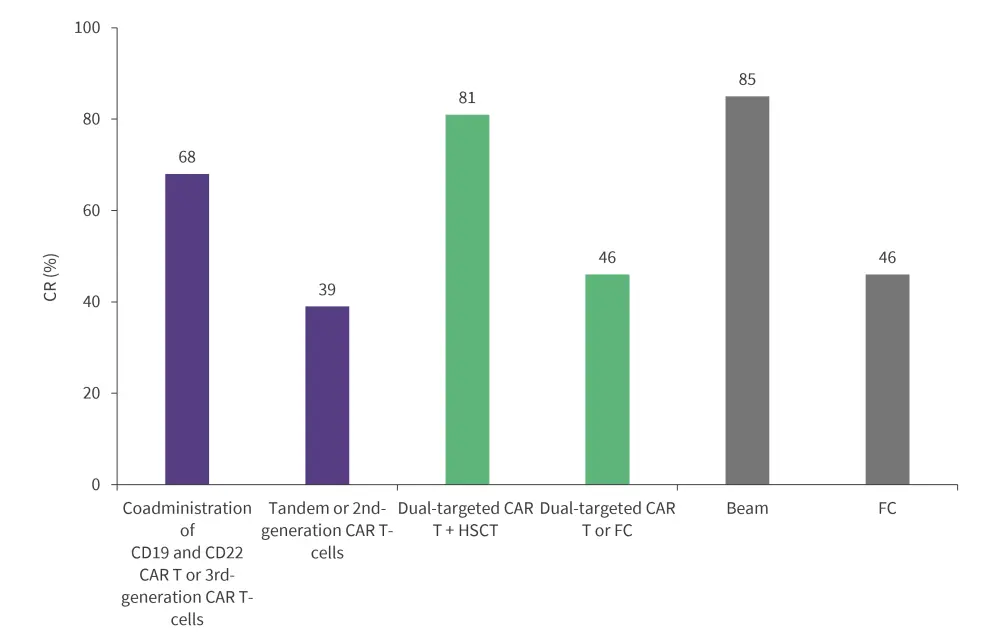 Figure 1. CR across dual-targeted approach, CAR T generation, and lymphodepletion regimen in NHL studies*†