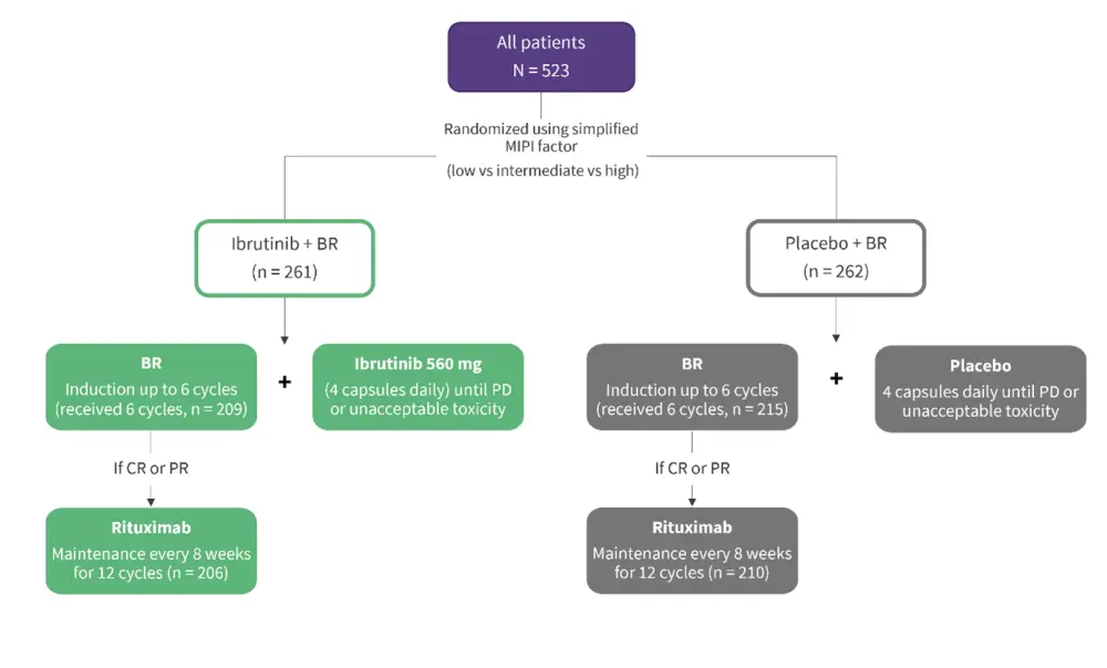 This is a double-blind, placebo-controlled, phase III randomized trial in elderly patients aged ≥65 years with stage II–IV disease and previously untreated MCL. Patients were either randomized to ibrutinib + BR or placebo + BR arms (Figure 1).