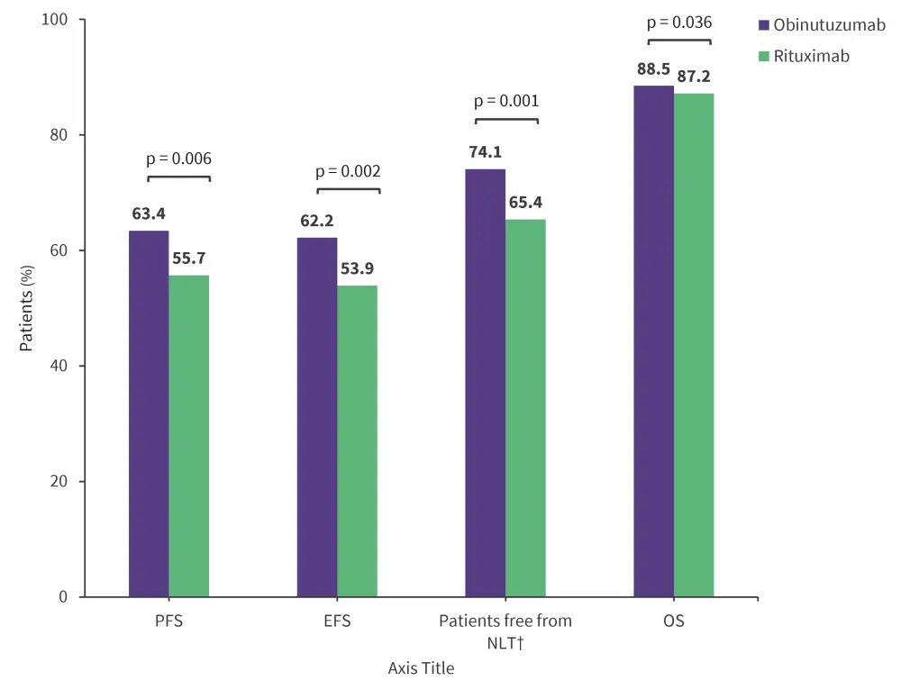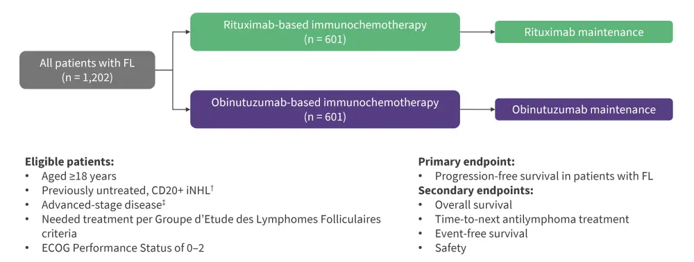 Rituximab-based chemotherapy has been shown to improve outcomes in patients with follicular lymphoma (FL). However, most patients relapse and overall survival is poor. Obinutuzumab, an anti-CD20 monoclonal antibody, has a greater antibody dependent cytotoxicity and B-cell killing effect than rituximab.1 The phase III GALLIUM trial (NCT01332968) assessed the efficacy and safety of obinutuzumab- versus rituximab-based immunochemotherapy in patients with previously untreated, advanced-stage indolent non-Hodgkin's lymphoma (iNHL), including follicular lymphoma (FL) or marginal zone lymphoma (MZL).