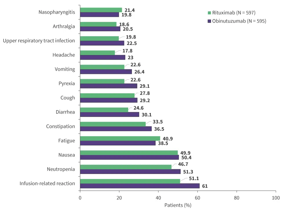 The most common adverse events in the FL cohort were infusion-related reaction, neutropenia, and nausea (Figure 4). In total, 48.9% of patients in the obinutuzumab arm and 43.4% of patients in the rituximab arm experienced a serious adverse event. Two deaths due to adverse events were reported in the obinutuzumab arm and seven in the rituximab arm. Most fatal adverse events occurred in patients who received bendamustine, with no difference between treatment arms (5.9% of patients who received obinutuzumab plus bendamustine versus 6.2% of patients who received rituximab plus bendamustine).