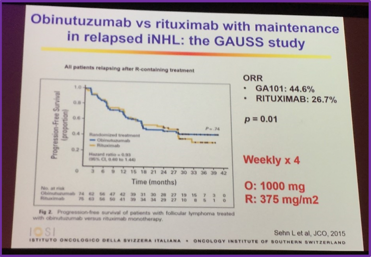 The talk then sought to answer the question of: are new anti-CD20 therapies any better? Professor Ghielmini began answering this by discussing findings which Sehn et al. published in the Journal of Clinical Oncology in 2015, which concluded that treatment of patients with relapsed CD20+ indolent B-cell NHL with obinutuzumab (GA101) results in a higher ORR.