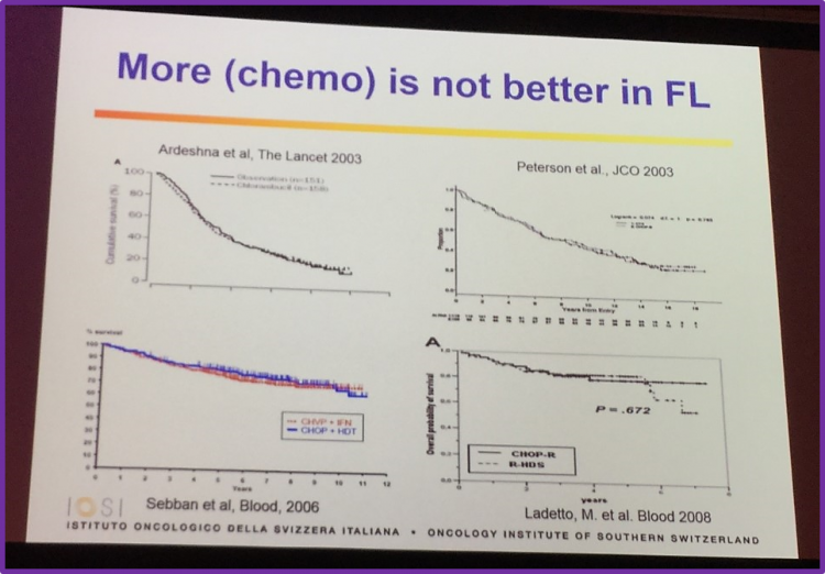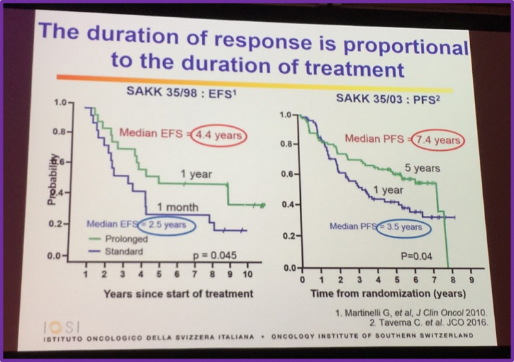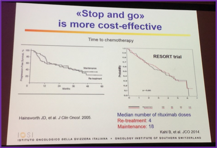 Professor Ghielmini discussed results from two different trials: SAKK 37/98 by Martinelli et al. who published in the Journal of Clinical Oncology in 2010, and the SAKK 35/03 trial by Taverna et al. who also published their findings in the Journal of Clinical Oncology but this year. Martinelli et al. found that at, median follow-up of 9.5 years, the median EFS in the observation arm compared to the prolonged exposure of single-agent rituximab arm was 13 months versus 24 months (P < .001). 5% of patients in the observation arm had no events at 8 years, compared to 27% of prolonged exposure arm. In untreated patients who responded to rituximab induction, 45% had no events at 8 years. This group concluded that a high number of patients experience long-term remission after prolonged exposure to rituximab, especially if no prior treatment had been given and they responded to induction with rituximab. Taverna et al. compared short-term and long-term rituximab maintenance in patients with FL. The SAKK 35/03 trial found that median PFS was 7.4 years (95% CI, 5.1 to not available) in the long-term arm, compared to 3.5 years (95% CI, 2.1 to 5.9) in the short-term arm (log-rank test, P = .04). Taverna et al.conclude that long-term maintenance with rituximab does not improve EFS or OS and was associated with increased toxicity, but does significantly lengthen PFS.