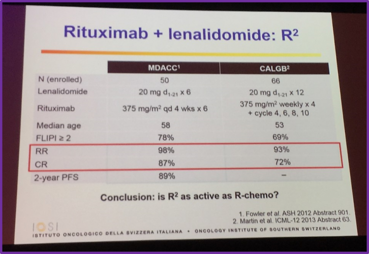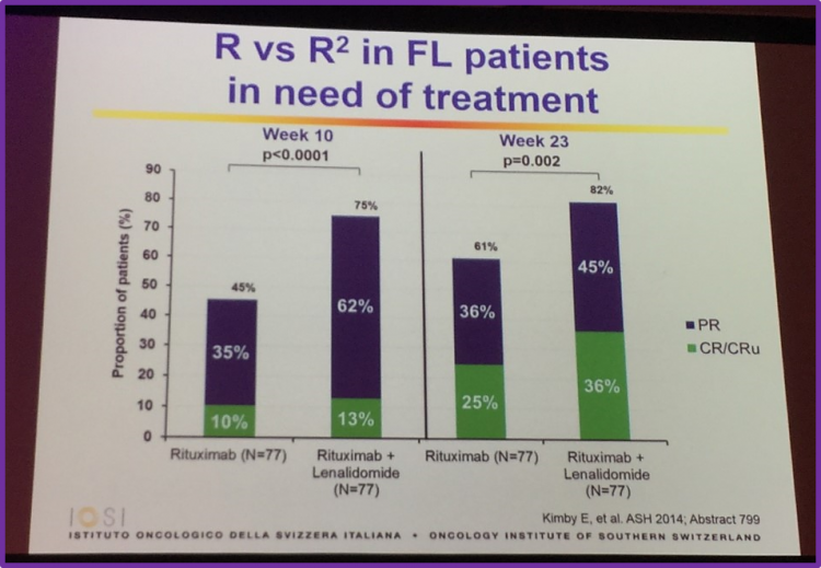 Abstract 799 from ASH 2014, by Kimby et al., was then discussed which included primary endpoint analysis of the randomized phase II trial SAKK 35/10. It was found that the CR/CRu rate was significantly higher in patients receiving R2 than patients just receiving rituximab. This was seen in both the ITT (CR/CRu rate, 36% vs 25%, respectively; P = 0.056) and the per-protocol population (CR/CRu rate, 42% vs 28%, respectively; P = 0.049). However, the group advise that further follow-up is required to observe if the improved response actually translates into increasing time to next treatment and better PFS and OS rates.
