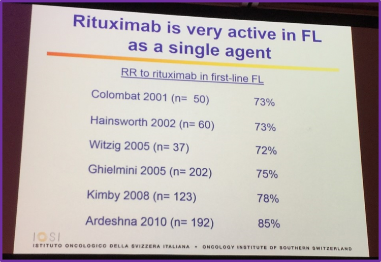 The talk then focused on discussing rituximab as first-line treatment for FL, drawing upon much research which resulted in very high Response Rates (RR).