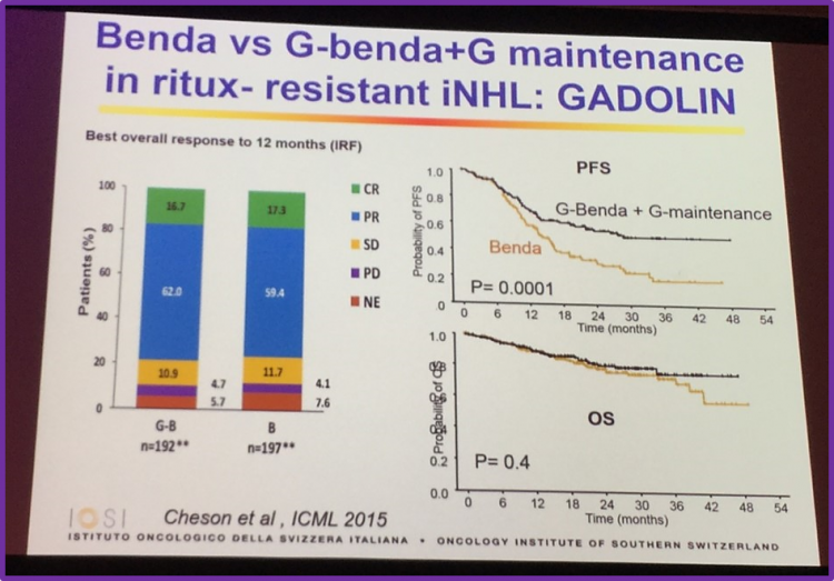 Professor Ghielmini also discussed results of the GADOLIN trial, a phase III study of obinutuzumab plus bendamustine versusbendamustine alone to treat patients with rituximab-refractory indolent NHL. The key conclusions of this trial were: