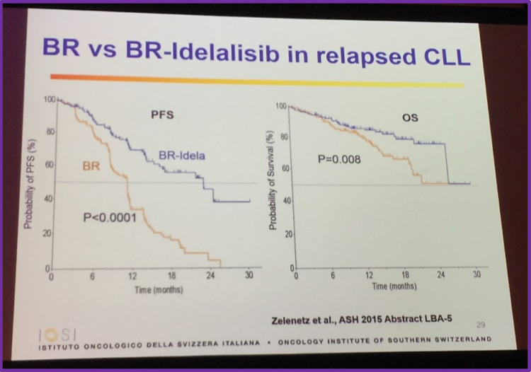 Data produced by Zelenetz et al. was presented at ASH 2015 (abstract LBA-5; NCT01569295) found that idelalisib in combination with bendamustine-rituximab was superior to bendamustine-rituximab alone, increasing PFS and OS. Professor Ghielmini informed the audience of an important drug warning, issued on 11th March 2016, stating that there is an “increased risk of death and serious adverse events, generally due to infections, in patients receiving idelalisib for first line treatment of Chronic Lymphocytic Leukemia (CLL) and relapsed indolent NHL.”