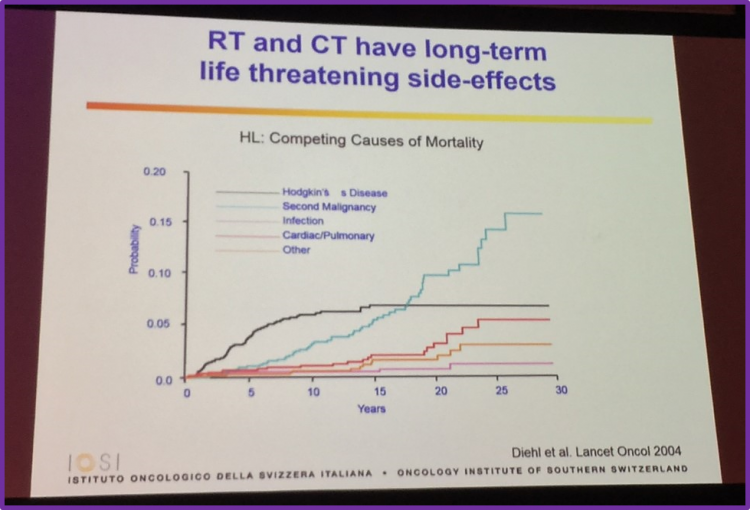 Data published by Diehl et al. in Lancet Oncology in 2004 demonstrates that mortality amongst patients with Hodgkin Lymphomas (HL) have many different competing causes including the disease itself, secondary malignancies, infections and cardiac/pulmonary complications.