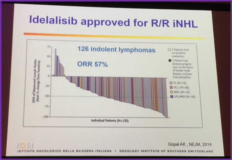 He began with discussion idelalisib, stating it has been approved for the treatment of follicular B-cell NHL. Data published by Gopal et al. in the New England Journal of Medicine in 2014 was also discussed, which found that idelalisib showed anti-tumor activity in patients with iNHL who were refractory to rituximab and alkylating agents, resulting reductions in tumor size in 90% of patients, with 57% meeting the criteria for an objective tumor response.