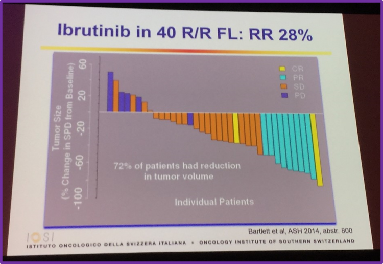 Ibrutinib was the next small molecule covered in this talk, with results by Bartlett et al., who presented at ASH 2014 (abstract 800), being discussed. They found that single agent ibrutinib is tolerated well and demonstrated a modest ORR in patients with R/R FL. At a median follow-up of 6.5 months, the ORR for the 40 ITT patients was 30% (95% CI: 17–47%). Other data discussed included RR and reduction in tumor size (see image below).