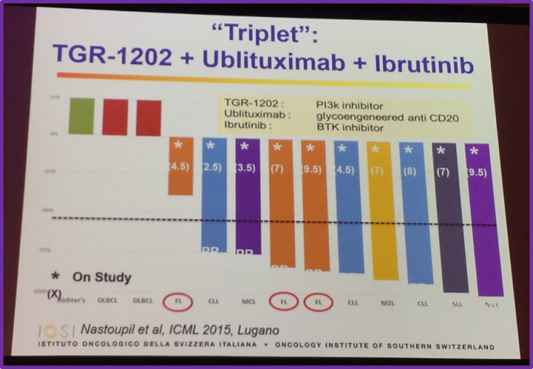 Professor Ghielmini began this topic by discussing the “triplet”: TGR-1202 plus ublituximab plus ibrutinib. Data presented by Nastoupil et al. at ICML 2015, in Lugano, found that the combination of ublituximab, TGR-1202 and ibrutinib had an acceptable safety profile in patients with relapsed B-cell malignancies. In particular, a durable PR of over 9 months was reported in one particular ibrutinib refractory FL patient.