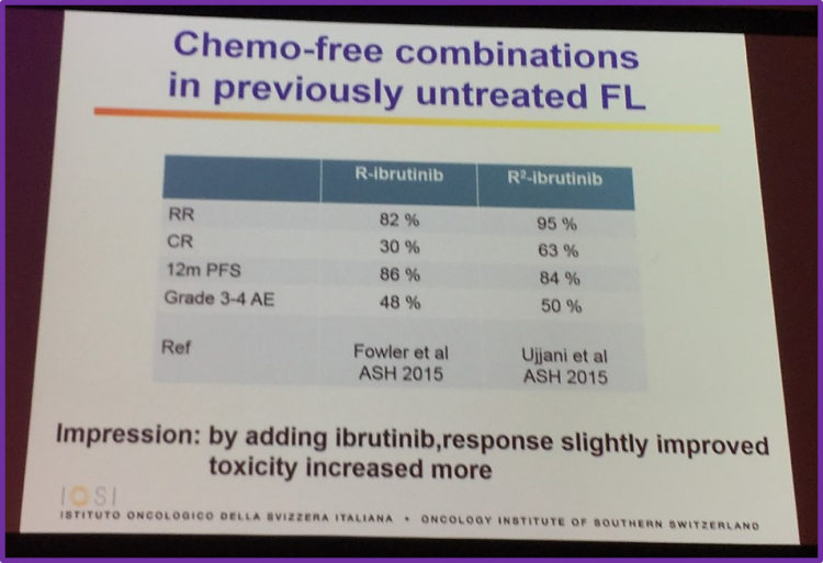 This portion of the talk also covered chemo-free combinations in previously untreated patients with FL: