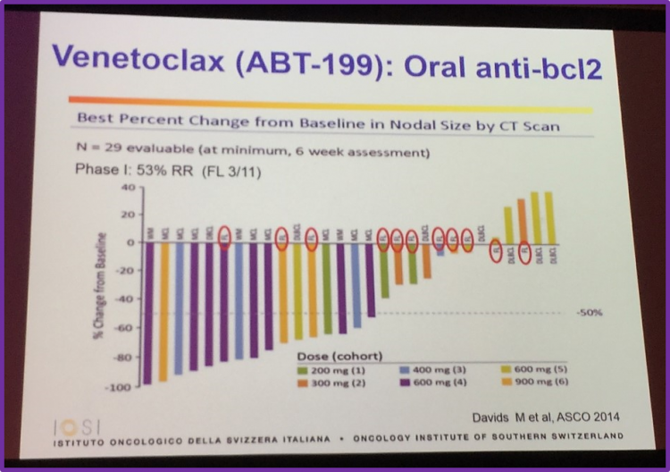 The oral, anti-BCL-2 small molecule venetoclax (ABT-199) was also covered in this talk. Professor Ghielmini covered results of a phase I study by Davids et al., which was presented at ASCO 2014 (abstract 8522), which enrolled 11 FL patients (26%). All responses in FL patients were observed at doses ≥600mg (3/6 FL; 50%). Conclusions of this study were that venetoclax monotherapy demonstrated anti-tumor activity across a range of doses for several NHL subtypes and in FL responses were observed at higher doses.