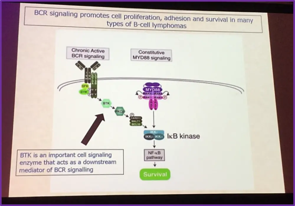 Targeting the B cell receptor (BCR) signaling pathway has proven to be very promising for therapy in Lymphomas. The BCR signaling pathway supports cell survival, proliferation and differentiation in many B-cell Lymphomas. Bruton’s Tyrosine Kinase (BTK) is a kinase located downstream of the BCR signal and it is a crucial mediator in the BCR signaling cascade. Hence, clinical researchers have targeted BTK for therapy in lymphoma patients. Clinical research has shown ibrutinib, a BTK inhibitor, to have a high efficacy in patients with either Relapsed or Refractory (R/R) Mantle Cell Lymphoma (MCL) or in 1st line for Chronic Lymphocytic Leukemia (CLL) / Small Lymphocytic Leukemia and CLL/SLL with 17p deletion and it has been approved by the Food and Drug Agency (FDA) in these indications and by the European Medicines Agency (EMA) in R/R MCL, in 1st line CLL, in combination with rituximab and bendamustine for CLL patients in 2nd line and in Waldenström macroglobulinemia . Additionally, in high-risk patients, data regarding ibrutinib, seem to be encouraging for its use in therapy. Ibrutinib also has a high efficacy in patients with MyD88 Lymphomas and preliminary results indicate that ibrutinib can have an effect in ABC-Diffuse Large B-cell Lymphoma (DLBCL).
