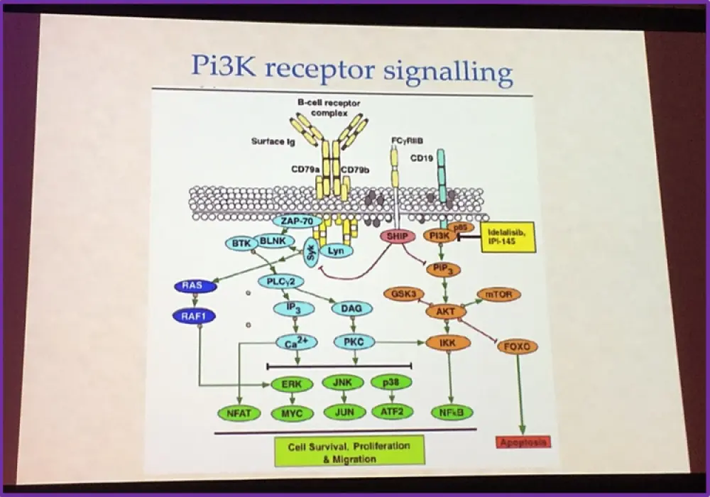 Another strategy researchers have identified for therapy of Lymphomas is the PI3K signaling pathway. The PI3K receptor signaling pathway can signal for cell survival and proliferation in cells and thus a crucial target for therapy in Lymphoma patients. Idelalisib, a PI3K inhibitor, has been shown to be active and effective in R/R Follicular Lymphoma (FL), CLL and MCL. However, there are some adverse side effects associated with this agent including diarrhea, pneumonitis and pyrexia. Idelalisib is currently approved by the FDA for the treatment of patients with either R/R CLL, FL (after 2 prior lines of treatment) or Small Lymphocytic Leukemia (SLL) and approved by the EMA for the treatment of patients with either CLL (in 2nd line or in maintenance for patients with 17p deletion or TP53 mutation; in combination with rituximab) or FL (in monotherapy for R/R patients after 2 lines of therapy). PI3K inhibitors are very promising for therapy in lymphomas and several clinical trials are currently on-going.