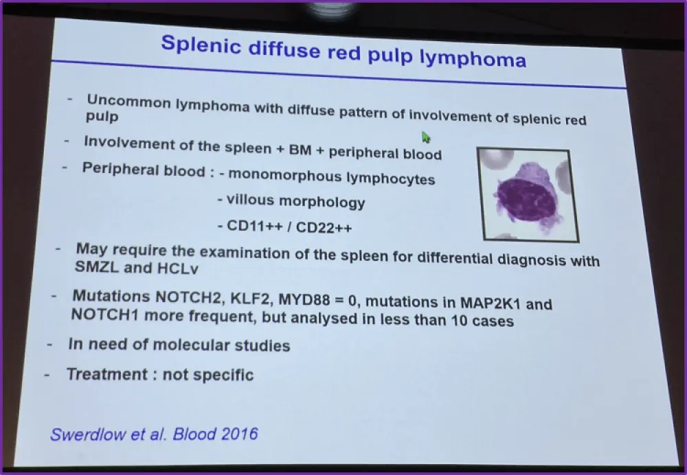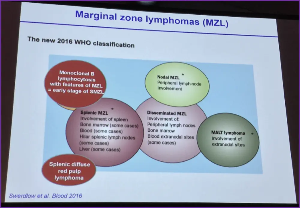 The session began with an update on the WHO classification of MZL sub-types, published in 2016, displayed below. The key changes since the 2008 classification were the classification of monoclonal B-cell lymphocytosis with features of MZL and the addition of splenic diffuse red pulp lymphoma. Splenic diffuse red pulp lymphoma was subsequently detailed.