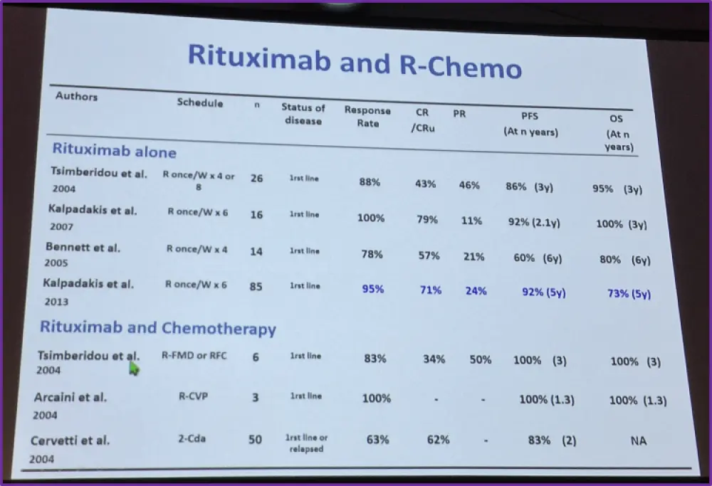 The main therapeutic options for SMZL were presented as being splenectomy, chemotherapy, R or combined R-chemotherapy. Each of these options was then discussed in turn by Professor Thieblemont. Splenectomy was shown to result in correction of cytopenias and a reduction in bone marrow infiltration with a median treatment time of longer than 8 years. 5-year PFS and OS following splenectomy in a trial of 100 SMZL patients were shown to be 61% and 84%, respectively, with 10-year PFS and OS being 46% and 67%, respectively (Lenglet J. et al. Leukemia & Lymphoma, 2013). Chemotherapy after splenectomy has not been shown to be beneficial, however it may be necessary in high-grade lymphoma in cases of transformation. A summary of trials conducted on the efficacy of R and R-chemotherapy were presented, shown below.