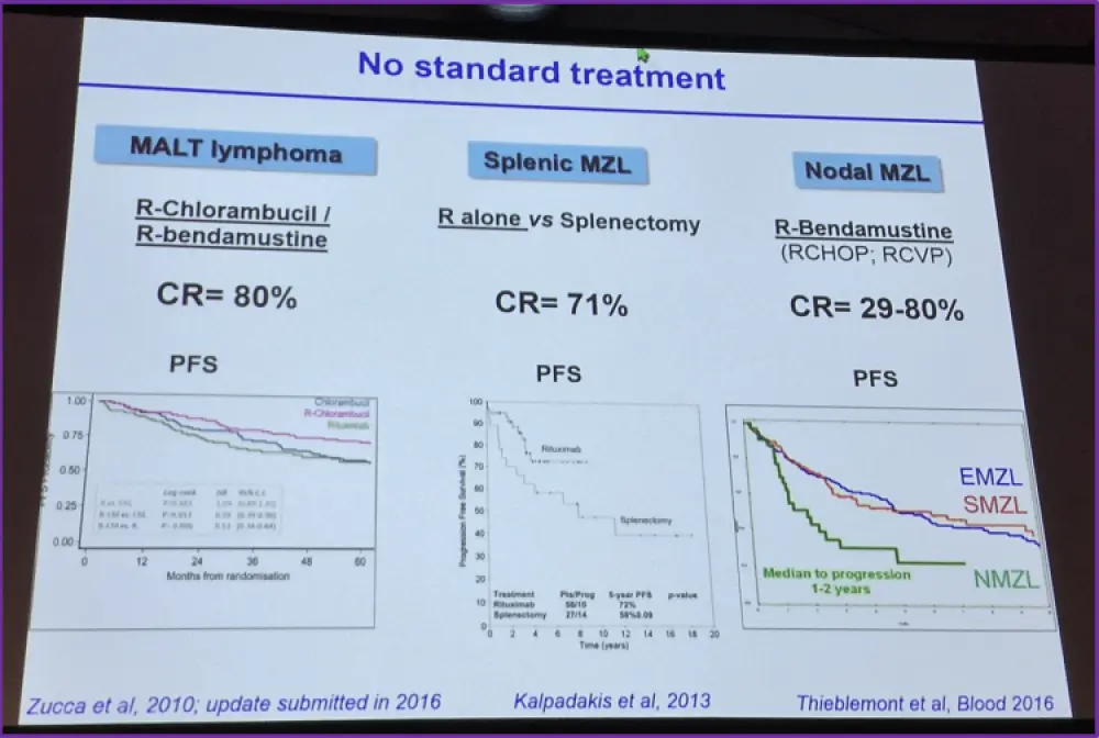 In summary, there is no standard treatment for MALT lymphoma, SMZL or NMZL, with NMZL currently being treated similarly to FL.