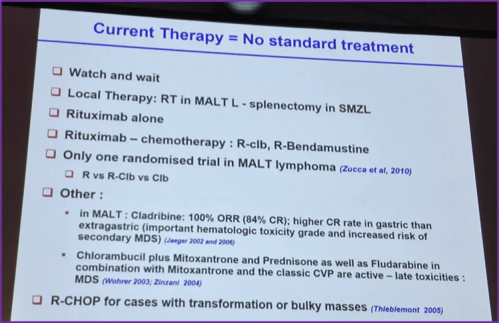 Currently, there is no standard treatment for the different MZL subtypes and Professor Thieblemont summarized the current approaches to treatment, shown below.
