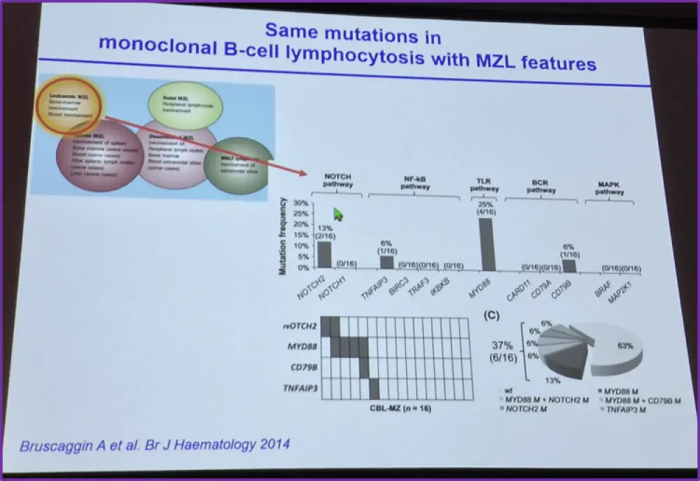 Data was presented that showed that the subtypes of MZL share common signaling pathways, for example SMZL, NMZL, MALT lymphoma and monoclonal B-cell lymphocytosis share a higher frequency of mutations in the NFkB pathway. SMZL, NMZL and monoclonal B-cell lymphocytosis also share increased mutation frequency in NOTCH, TLR (MYD88) and BCR pathways.