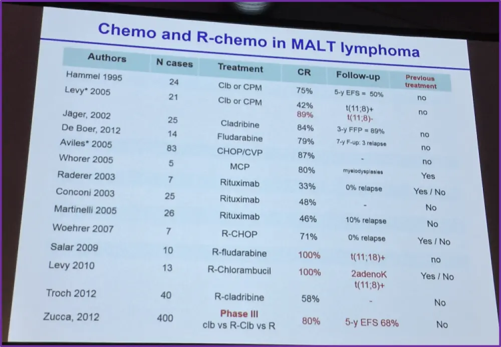 In cases of MALT lymphoma non-dependent to a pathogen, there are multiple therapeutic options, which were discussed during the session. For stage I and II, these were radiation (30Gy), rituximab (R) and R-alkylant. For stage III-IV, the options were only R-alkylant and R. Results from multiple trials performed in MALT lymphoma were also presented, shown below.