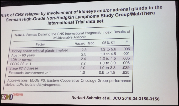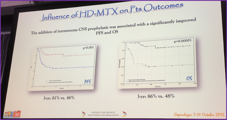Their main conclusions at the end of this presentation were that combination prophylaxis with HD-MTX ± IT is highly effective in patients with DLBCL with high-risk of CNS relapse. They tempered this result by reminding the audience that this was a retrospective study and that the high mortality rates associated with CNS relapse could result in the reported OS effect.