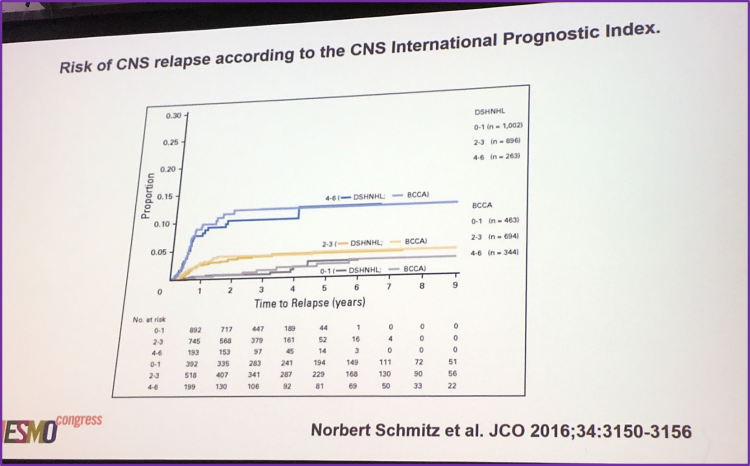Following this presentation, a discussion session was chaired by Professor Peter Johnson from the Faculty of Medicine, University of Southampton, UK. Data was presented on the risk of CNS relapse using either the IPI score or the involvement of specific extranodal organs, the two methods by which Calimeri T. et al. defined the high-risk group.