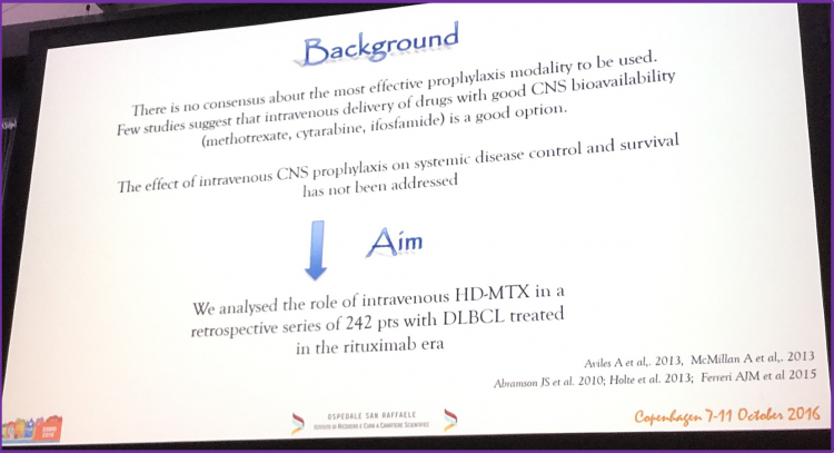 Dr Teresa Calimeri from the San Raffaele Scientific Institute in Milan, Italy, and colleagues presented during the ESMO congress in October 2016 in Copenhagen, Denmark data from a retrospective study of 242 patients with Diffuse Large B-Cell Lymphoma (DLBCL), analyzing the effect of risk-tailored CNS prophylaxis with High-Dose Methotrexate (HD-MTX).