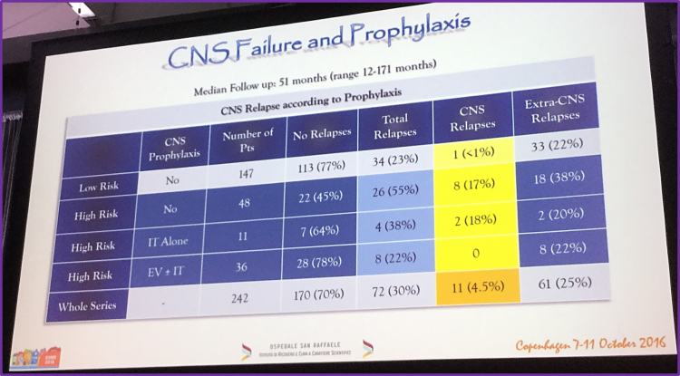 They reported that with a median follow-up time of 51 months, no one in the high-risk with HD-MTX ± IT prophylaxis group developed CNS relapse. However, two patients (18%) in the IT alone prophylaxis group, and 8 patients (17%) in the no prophylaxis group, developed CNS relapse.