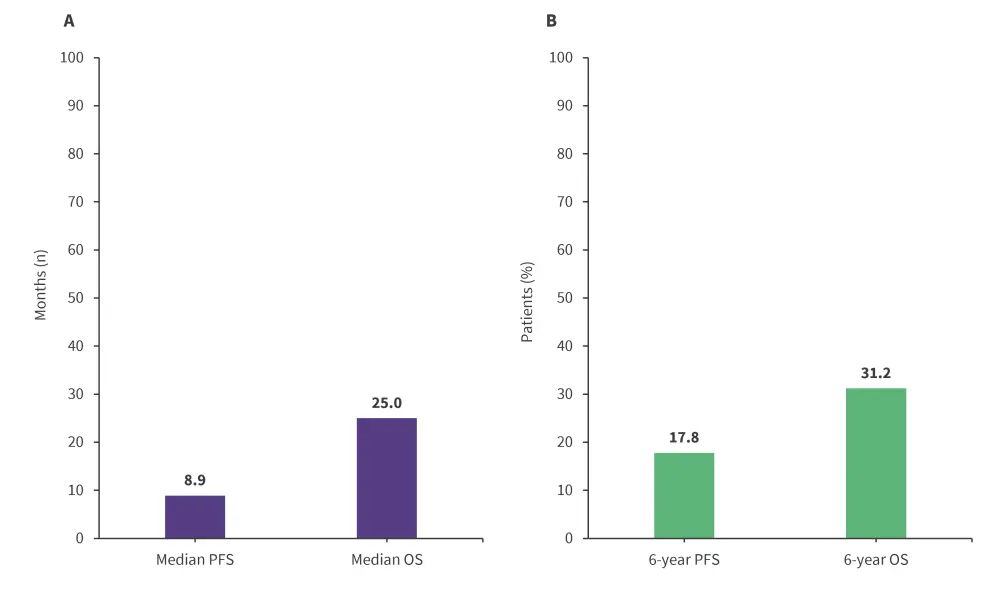 The median follow-up was 79.6 months, and the median DOR was 18.9 months; the 6-year DOR was 26.4%. The progression-free survival (PFS) and overall survival (OS) rates for all patients who received CAR T-cell therapy are shown in Figure 1.