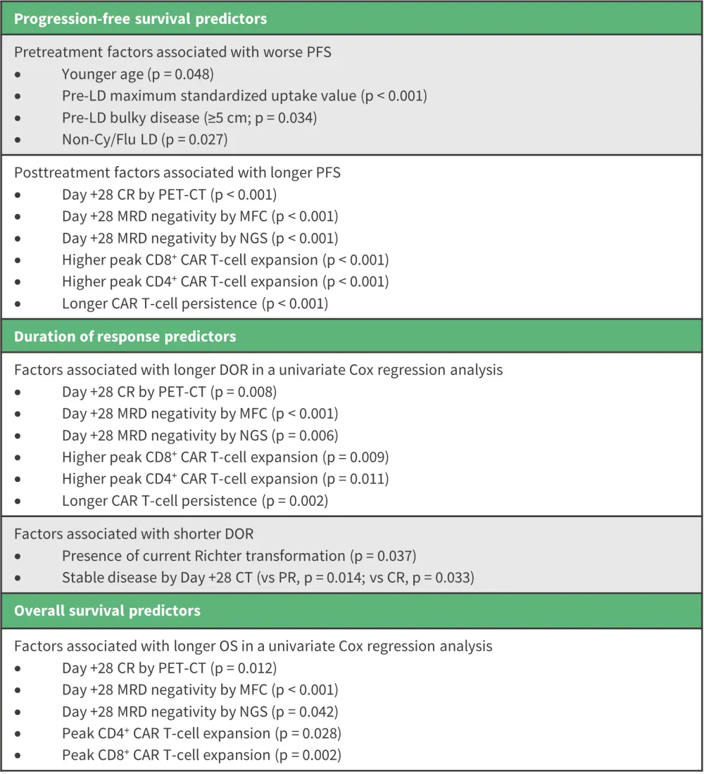 While CD19-targeted chimeric antigen receptor (CAR)-modified T-cell therapy has shown high response rates in patients with relapsed/refractory (R/R) chronic lymphocytic leukemia (CLL), there is limited research on the factors associated with duration of response (DOR).