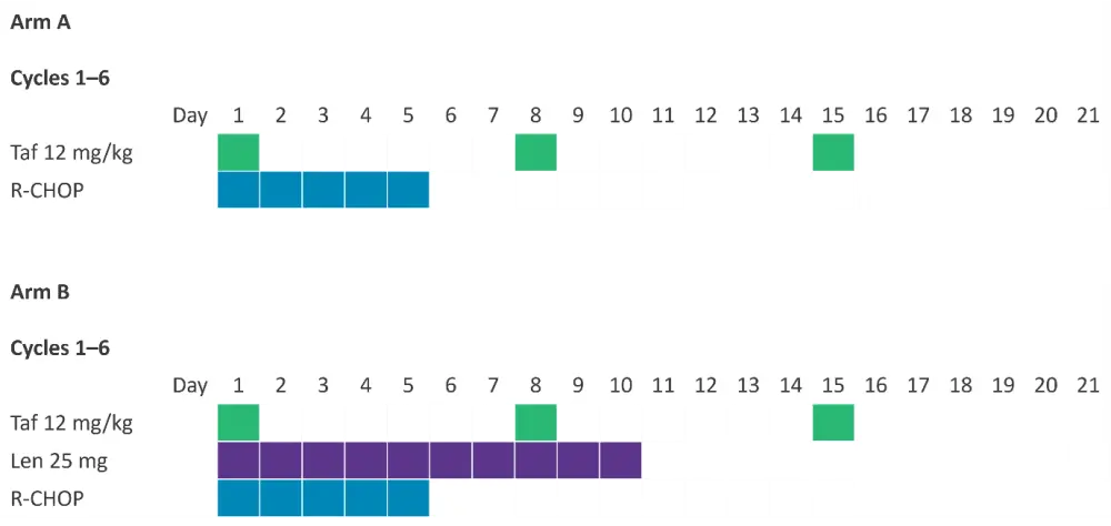 Arm B: R-CHOP + tafasitamab + lenalidomide |