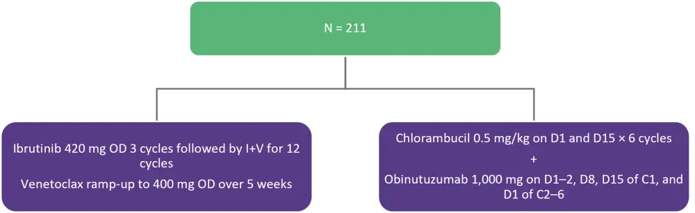 The phase III GLOW trial enrolled 211 patients with previously untreated CLL/SLL. Patients were ≥65 years of age or 18–64 years of age and unfit (cumulative illness rating scale >6 or creatinine clearance <70 mL/min). Eligible patients had Eastern Cooperative Oncology Group performance status (ECOG PS) of 0–2 and no del(17p) or known TP53 mutations and were stratified by immunoglobulin heavy chain variable region gene (IGHV) status and presence of del(11q). Patients were randomized as shown in Figure 1.