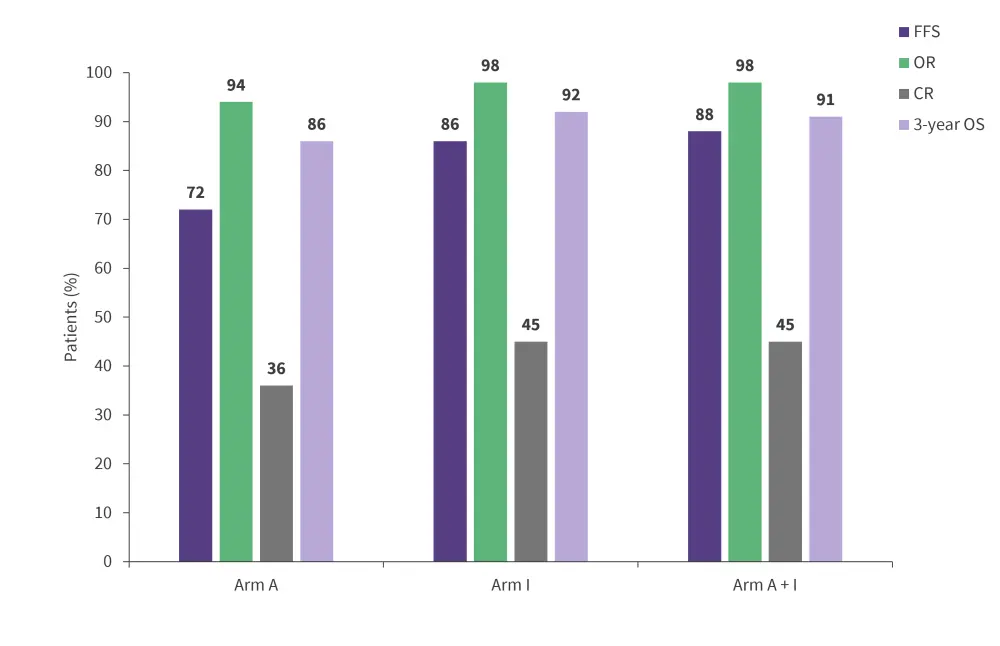 The primary outcome was failure-free survival (FFS), with stable disease at the end of induction, progression, and death constituting qualifying events. Key secondary outcomes included response rates, progression-free survival, overall survival, and safety.