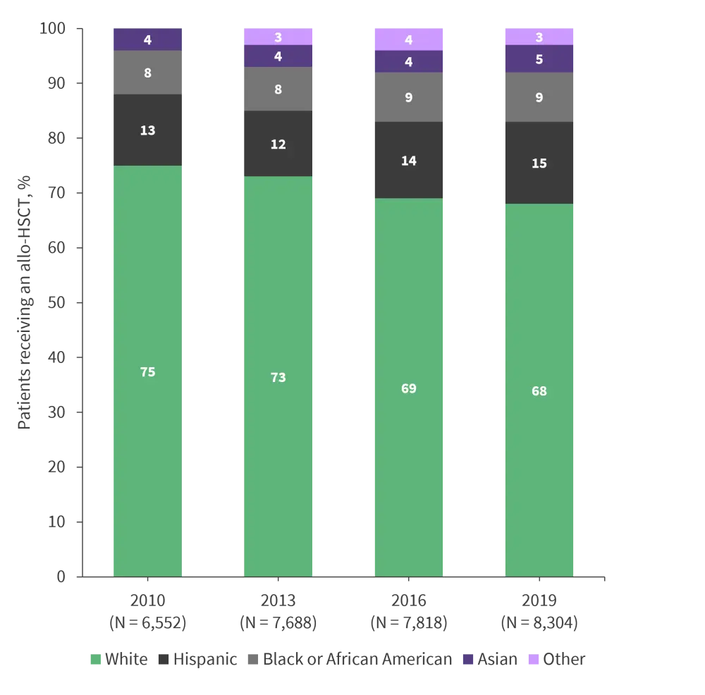 Since 2010, the number of patients receiving an allogeneic hematopoietic stem cell transplant (HSCT) has increased, but the proportion of patients from different ethnic groups has remained similar (Figure 4).