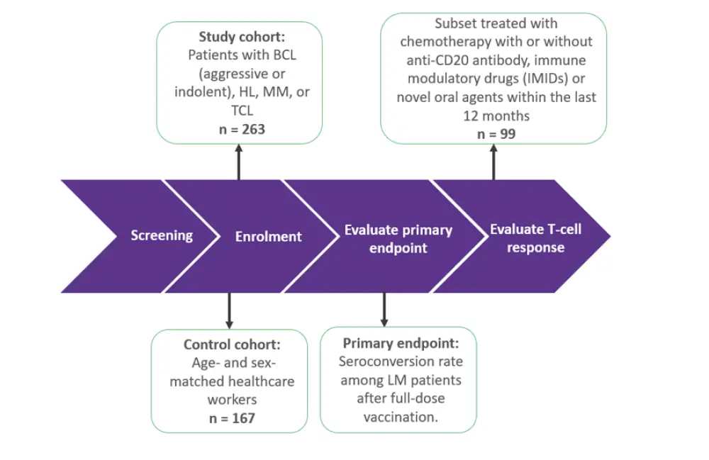 Factors that influence the efficacy of Severe Acute Respiratory Syndrome Coronavirus-2 (SARS-CoV-2) vaccination in patients with lymphoid malignancies are still not fully detailed. Immune dysregulation associated with active malignancies has proven to impair serological response, and concurrent anti-cancer treatment may also negatively influence humoral immune activity. Previous research has excluded the measurement of T-cell mediated immune responses following vaccination, which could play a protective role against infection irrespective of seropositivity.