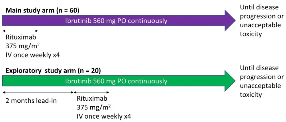 An open-label, non-randomized, multicentre, phase II study PCYC-1125-CA (NCT01980654) consisted of the main study arm and an exploratory arm. The aim of the main study was to evaluate efficacy and safety of rituximab plus ibrutinib, while the smaller exploratory study looked to explore biomarkers during ibrutinib therapy before administration of rituximab. The study design is presented in Figure 1.