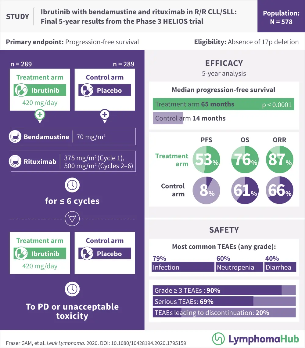 HELIOS was a randomized, double-blind, placebo-controlled phase III trial of 578 patients with relapsed/refractory (R/R) CLL/SLL.