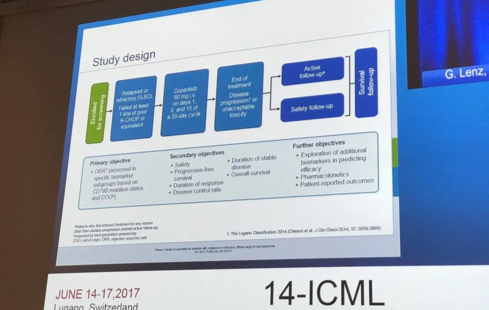 The first talk in this session was given by G. Lenz from the University of Münster, Münster, Germany, and conveyed results from an open-label, single-arm, phase II trial (NCT02391116) of copanlisib in patients with Relapsed/Refractory (R/R) Diffuse Large B-Cell Lymphoma (DLBCL).