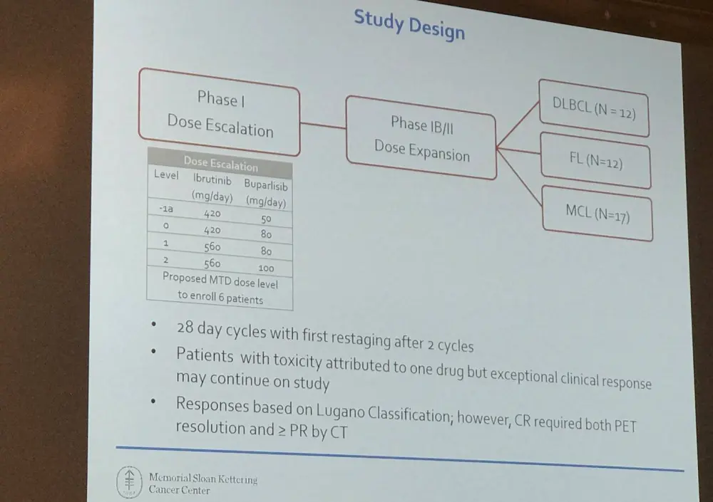 Another phase IB dose escalation and expansion study was the topic of the next abstract presented by Connie Lee Batlevi from Memorial Sloan Kettering Cancer Center, New York, NY, USA. This study evaluated a combination of ibrutinib and buparlisib in patients with R/R FLBCL, MCL, and FL. Once again, the rationale for this study was pre-clinical data that has demonstrated synergism between BTK and PI3K inhibitors in B-cell NHL.