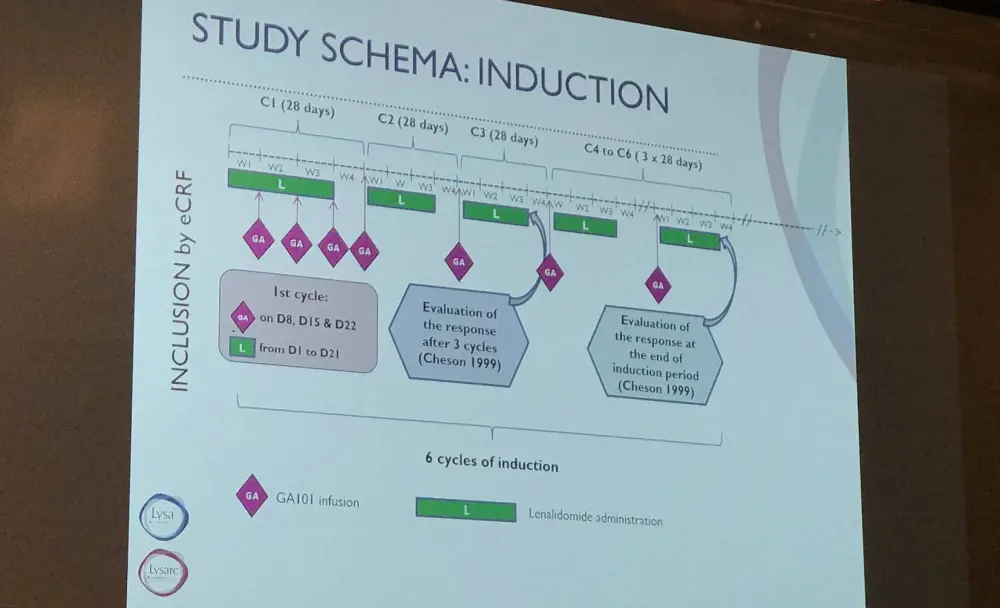 The next presentation was given by Franck Morschhauser from Centre Hospitalier Régional Universitaire de Lille, Lille, France, and contained results from a phase I/II trial by LYSA investigating obinutuzumab (GA) plus lenalidomide (LEN) for R/R FL (NCT01582776).