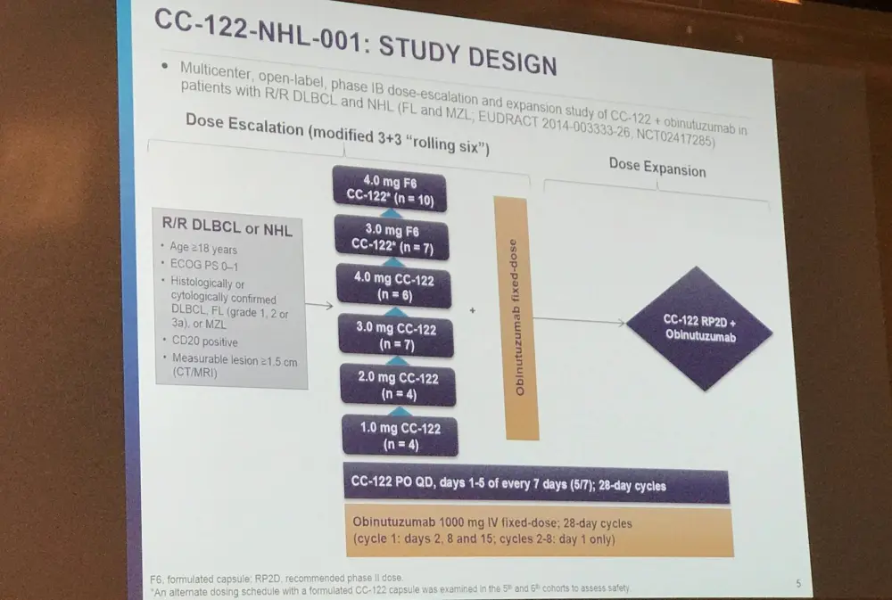 Primary endpoints of this phase IB trial included safety/tolerability, Non-Tolerated Dose (NTD), and Maximum Tolerated Dose (MTD) of CC-122 when co-administered with obinutuzumab. Secondary endpoints included ORR, DoR, PFS, and CC-122 PK. Response was assessed per Cheson 2007 criteria every 2 cycles to cycle 6, every 3 cycles to cycle 12, and every 6 cycles thereafter.