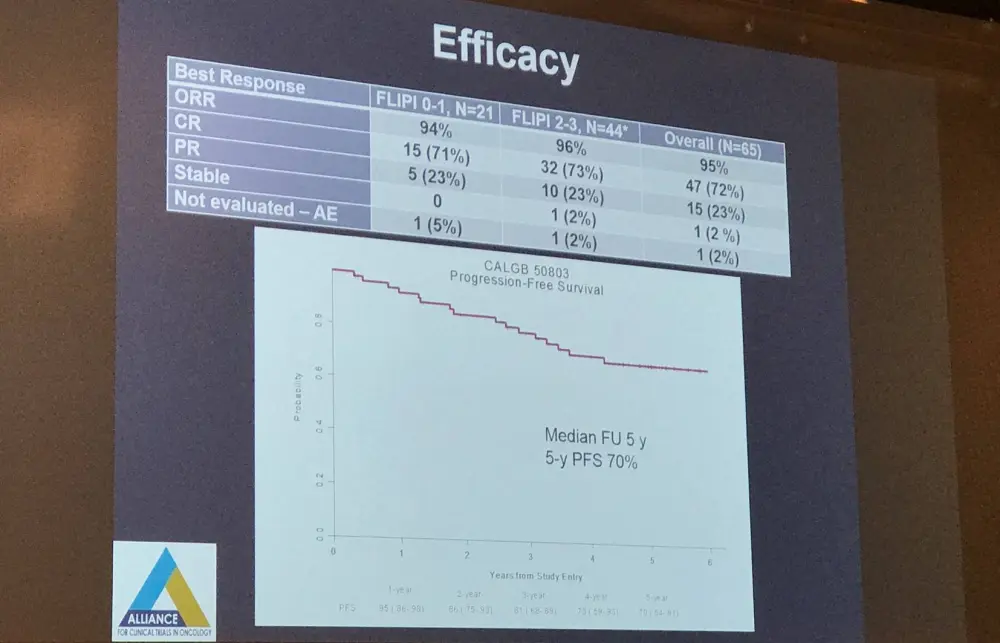 The rationale for the CALGB 50803 trial was that the rituximab-lenalidomide combination had been evaluated in a single center study and so P. Martin and colleagues wanted to evaluate it in a multicenter study. Based on toxicity from the previous single-center study, the dose was reduced to 20mg/day on days 1–21 of a 28-day cycle for 12 cycles. Rituximab administered 4-times weekly on cycle 1 and day 1 of cycle 4, 6, 8, and 10. Patients with untreated FL, grade 1–3a, stage 3–4 or bulky stage 2, and FL-IPI 0–2 were eligible. The primary outcome measure was Complete Response (CR) and polymorphisms in FcgR2A and FcgR3A were evaluated.