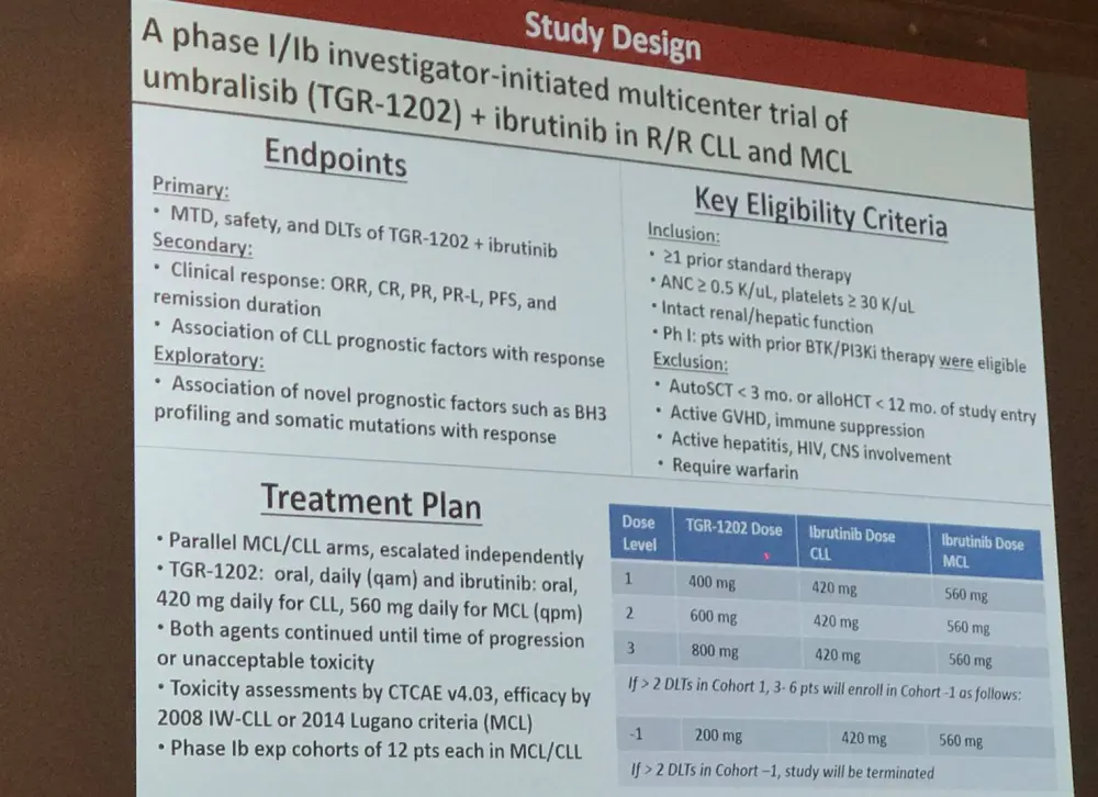 R/R MCL and CLL patients’ achieve limited depth and durability in their responses to ibrutinib. TGR-1202 (umbralisib) is a novel oral PI3Kδ inhibitor which carries a more favorable toxicity profile than other PI3K inhibitors. The group hypothesized that combining PI3K/BTK blockade using TGR-1202 and ibrutinib would be a tolerable and efficacious strategy to treat patients with R/R MCL and CLL.