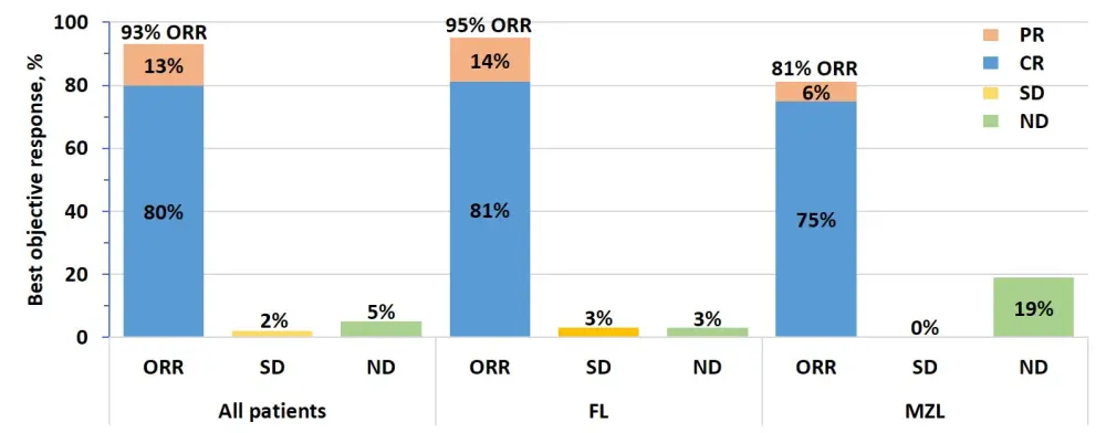 Figure 1. Objective response rates. CR, complete response; FL, follicular lymphoma; MZL, marginal zone lymphoma; ND, undefined/not done; ORR, objective response rate; PR, partial response; SD, stable disease