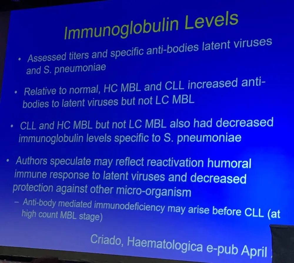 This portion of the talk began by outlining immunoglobulin levels in MBL (Criado et al. 2017):