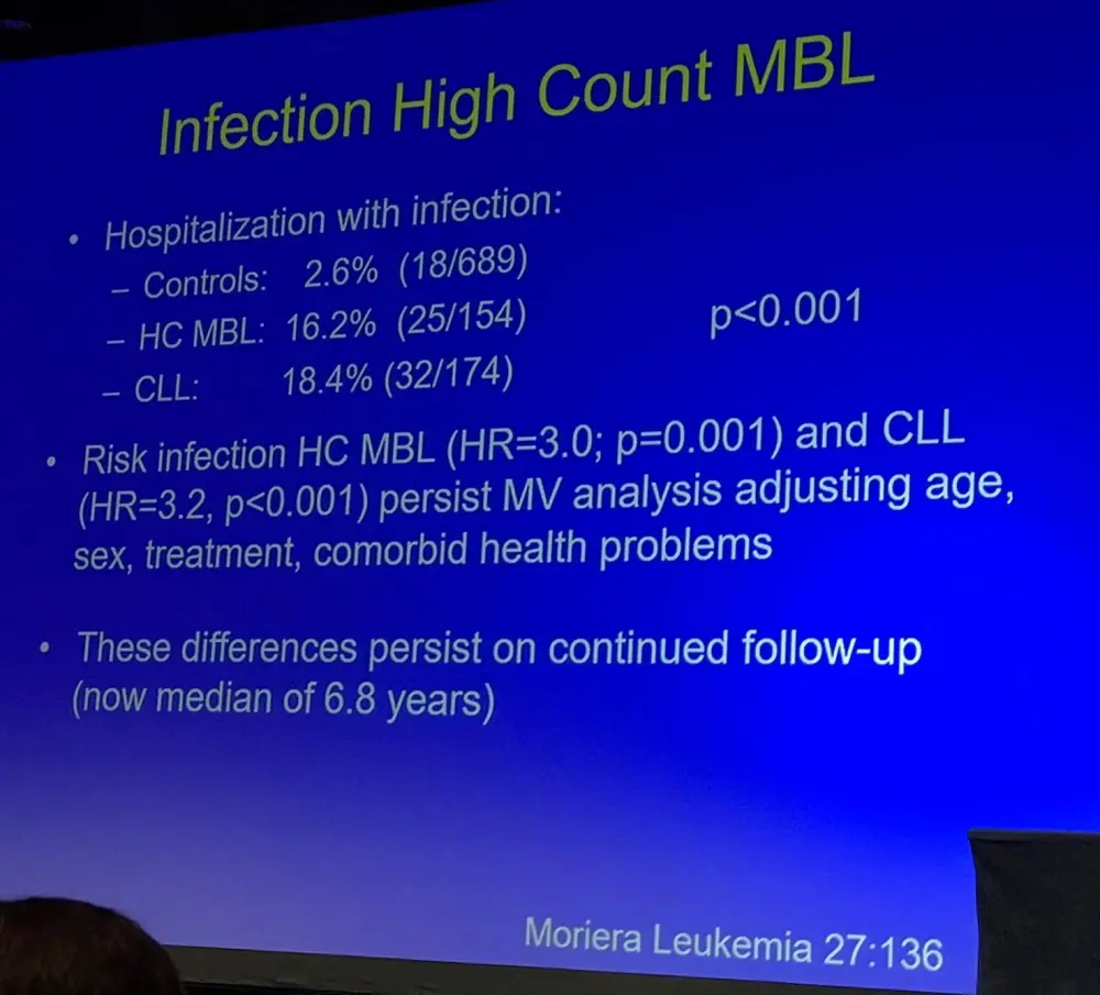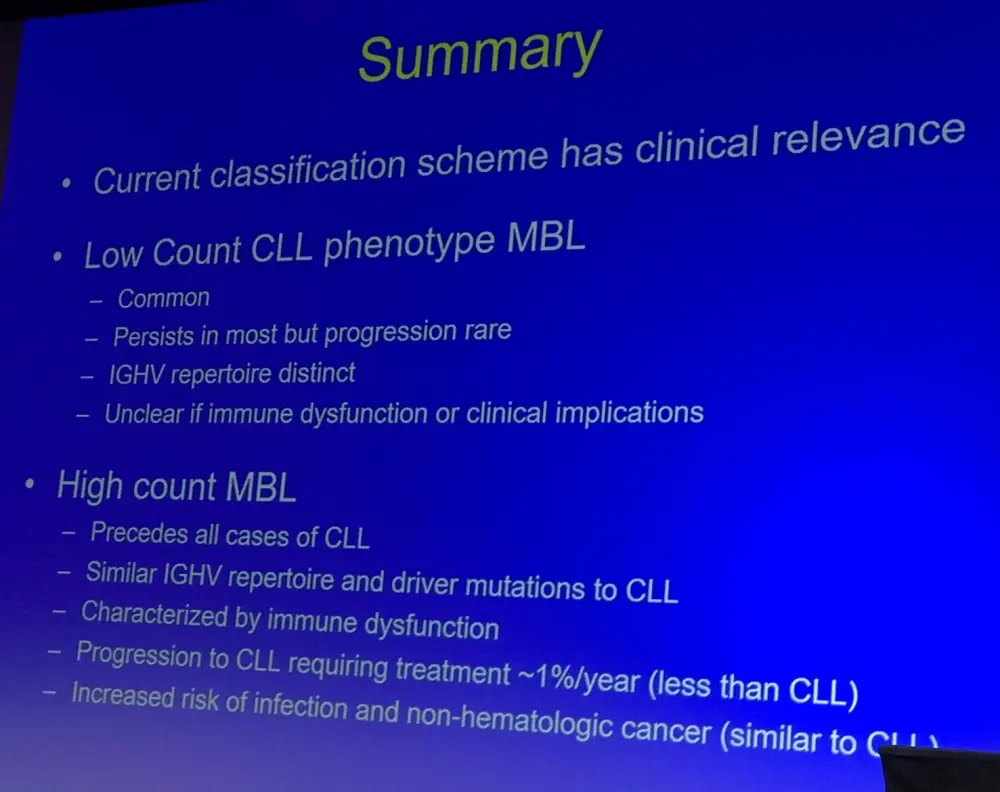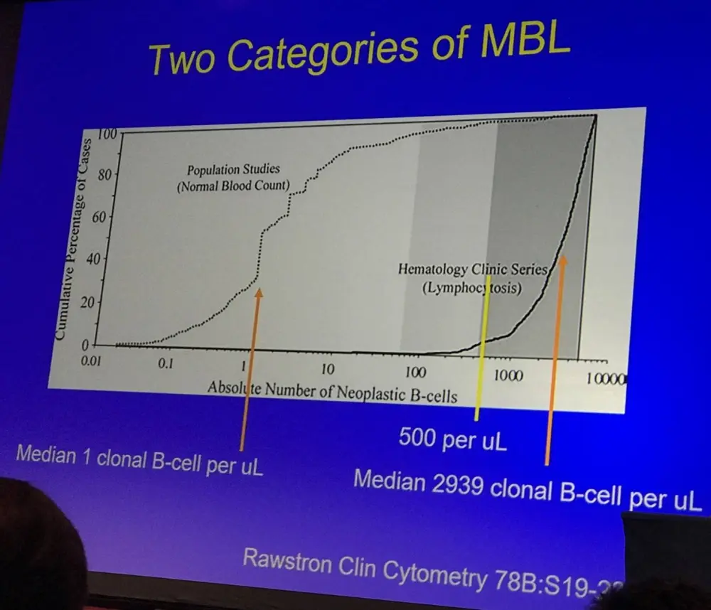 The talk then focused on findings published by Landgren et al., who conducted a PLCO screen trial in 77,469 healthy adults. Of these, 129 developed CLL. Pre-diagnosis samples were available for 45 cases and using 6 color flow cytometry and IGHV analysis by RT-PCR found that 44/45 had pre-existent MBL up to 6.4 years prior to CLL, and was present in both mutated and unmutated IGHV cases.