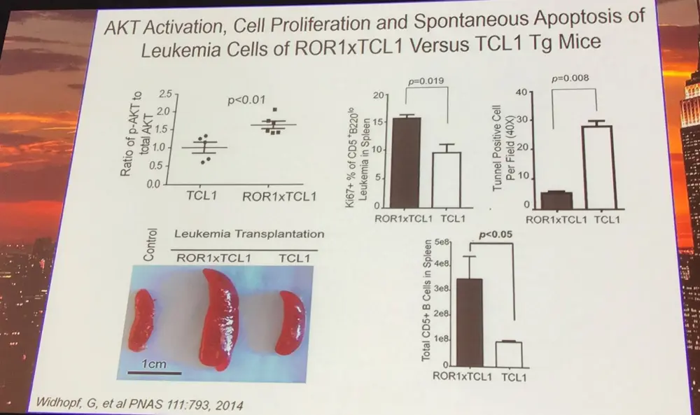 In TCL1 transgenic mice, ROR1 interacts with TCL1 an accelerated CD5+ B-cell lymphomagenesis. Moreover, in ROR1xTCL1 vs. TCL1 leukemia cells, genes which contribute to tumor cell viability are increased whereas those for tumor cell adhesion are decreased.