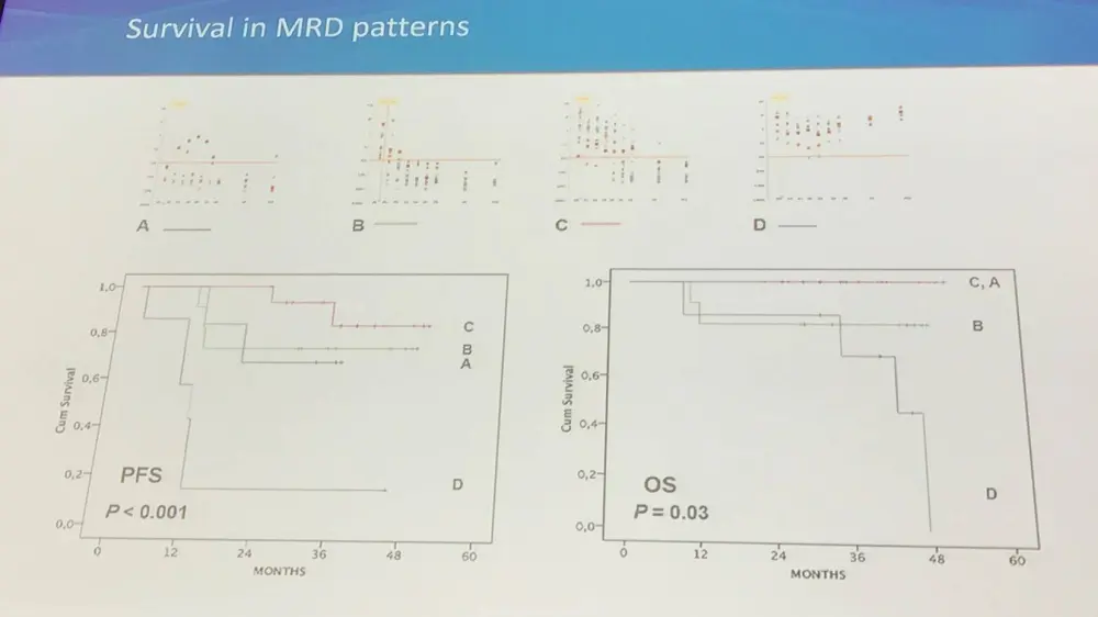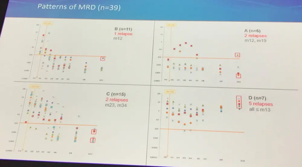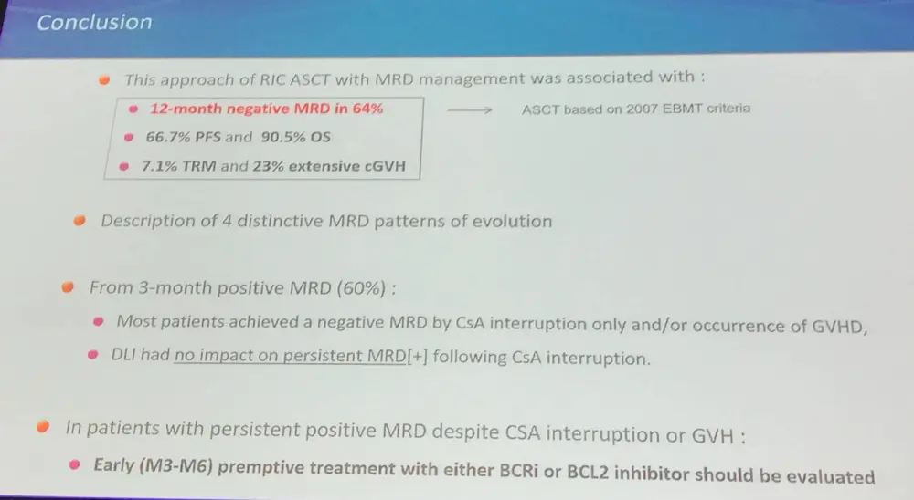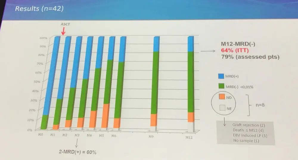 The ICLL003 RICAC-PMM study (NCT01849939) is a multicenter, phase II study by the FILO and SFGM-TC groups, and aimed to increase the rate of MRD-negativity at 12 months post-ASCT using a pre-emptive, MRD based, immune intervention algorithm. MRD-negativity was assessed by 10 color flow cytometry, and was defined as <0.01% (10-4) in blood and bone marrow. Between September 2012 and February 2015, 43 patients were included from 16 centers in France; 42 patients were included in the analysis (1 patient had no ASCT, due to donor comorbidities).